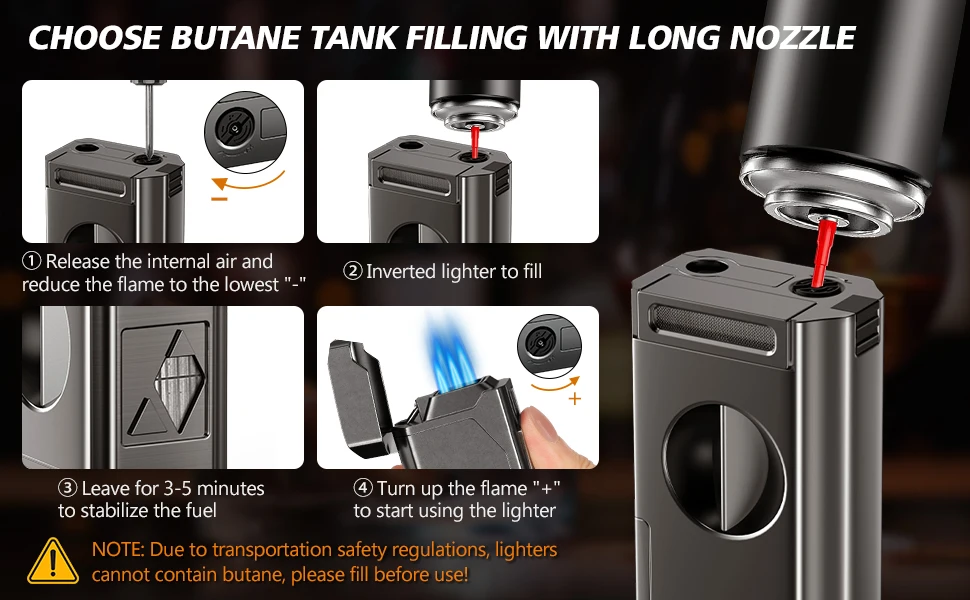 Encendedor de antorcha Quad Jet:Esta antorcha para encendedores de cigarros está hecha de aleación de zinc resistente y duradera y se combina con una llama de 4 chorros con tecnología de inyección de alta presión para asar los cigarros de forma rápida y uniforme, para que pueda disfrutar del sabor de sus cigarros más rápido.(NOTA: Debido a las regulaciones de envío, el encendedor no contiene butano, rellénelo antes de usarlo)