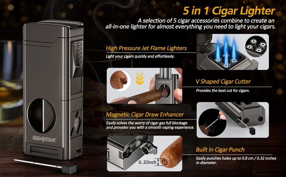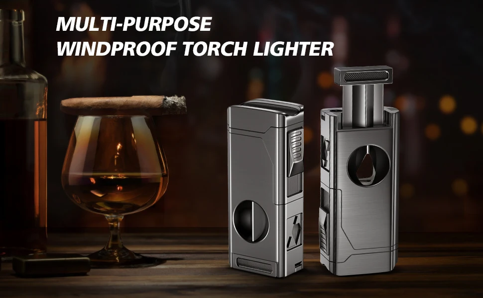 Encendedor multifunción:El diseño todo en uno combina perfectamente los accesorios para cigarros que necesita para disfrutar de sus cigarros con el encendedor, incluido el soporte para cigarros diseñado como la cubierta superior, el punzón plegable para cigarros en la parte inferior, potenciador de extracción de cigarros incorporado, y el cuerpo está hábilmente diseñado como un cigarro cortador en V, que le brinda la máxima comodidad.